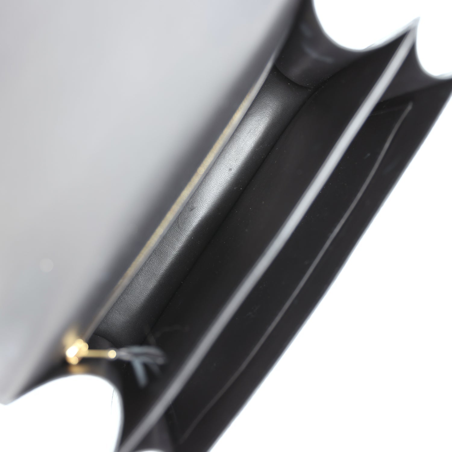 The interior is lined with black lambskin and has an open pocket on the front wall, two main compartments, back zip pocket and a slit pocket on the back wall.