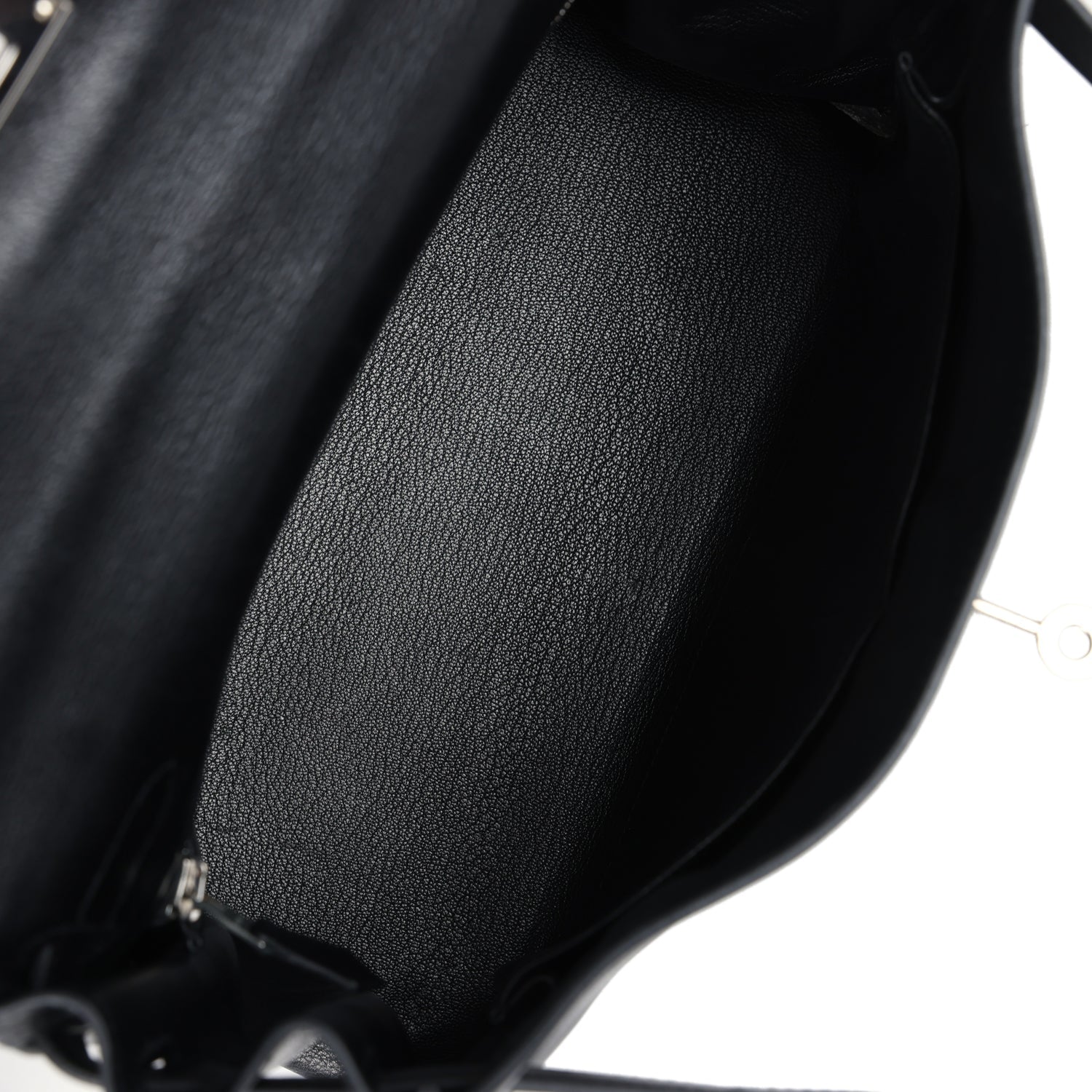 The interior is lined in Black chevre and has one zip pocket with Hermes engraved pull and two open pockets on the opposite side.