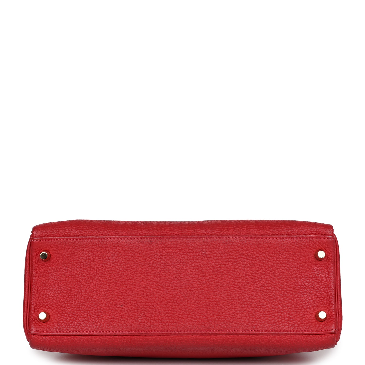 This Kelly is in Vermillion clemence leather with gold hardware, has tonal stitching, two straps with front toggle closure, clochette with lock and two keys, single rolled handle and removable shoulder strap.