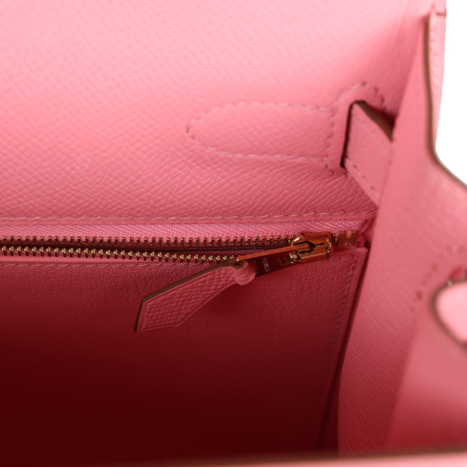 The interior is lined with Rose Confetti chevre leather and has one zip pocket with an Hermes engraved pull and two open pocket on the opposite side.