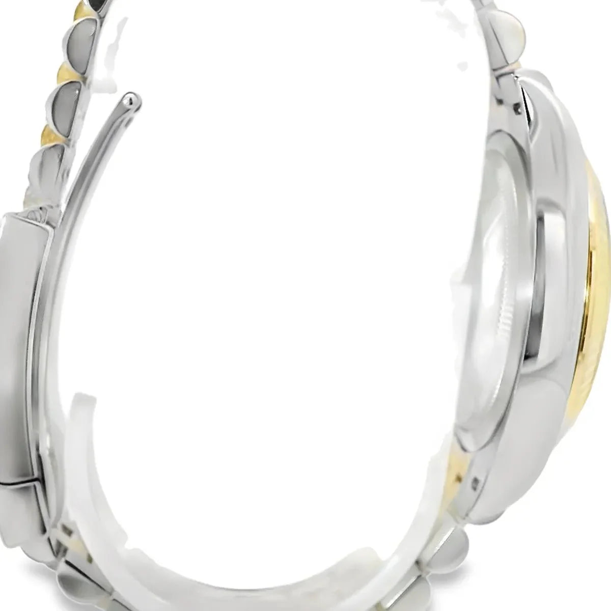 The Rolex Datejust 36 (reference 126233) combines classic elegance with modern sophistication. Its 36 mm case in Rolesor yellow, a sophisticated combination of Oystersteel stainless steel and 18-carat yellow gold, lends the watch a timeless aesthetic. The olive green dial sets a special highlight with its sparkling details: the Roman numerals VI and IX are set with a total of 24 diamonds and set in 18 carat gold, creating a luxurious accent.