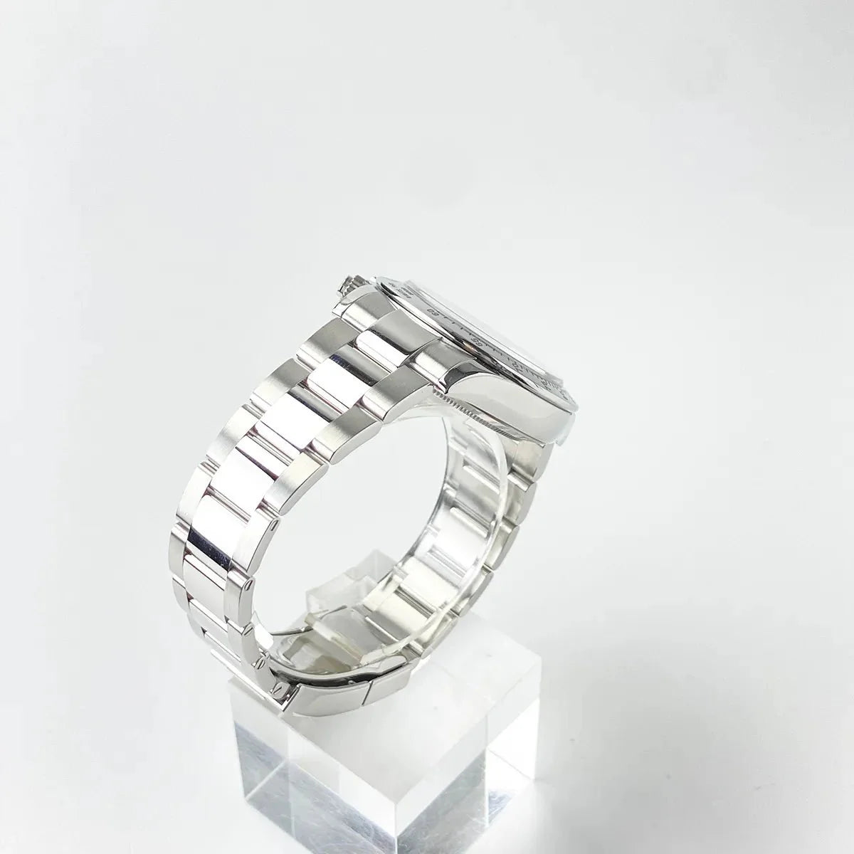 The case of the watch is made of robust stainless steel and has a diameter of 40 mm, which offers a balanced size for different wrists. The water resistance is 10 ATM, which makes the watch suitable for everyday use and moderate water sports. The bezel and bracelet are also made of stainless steel, and the watch is equipped with scratch-resistant sapphire crystal that protects the black dial. The dial itself is kept simple, without numerals, and offers a clear and elegant display of the time.
