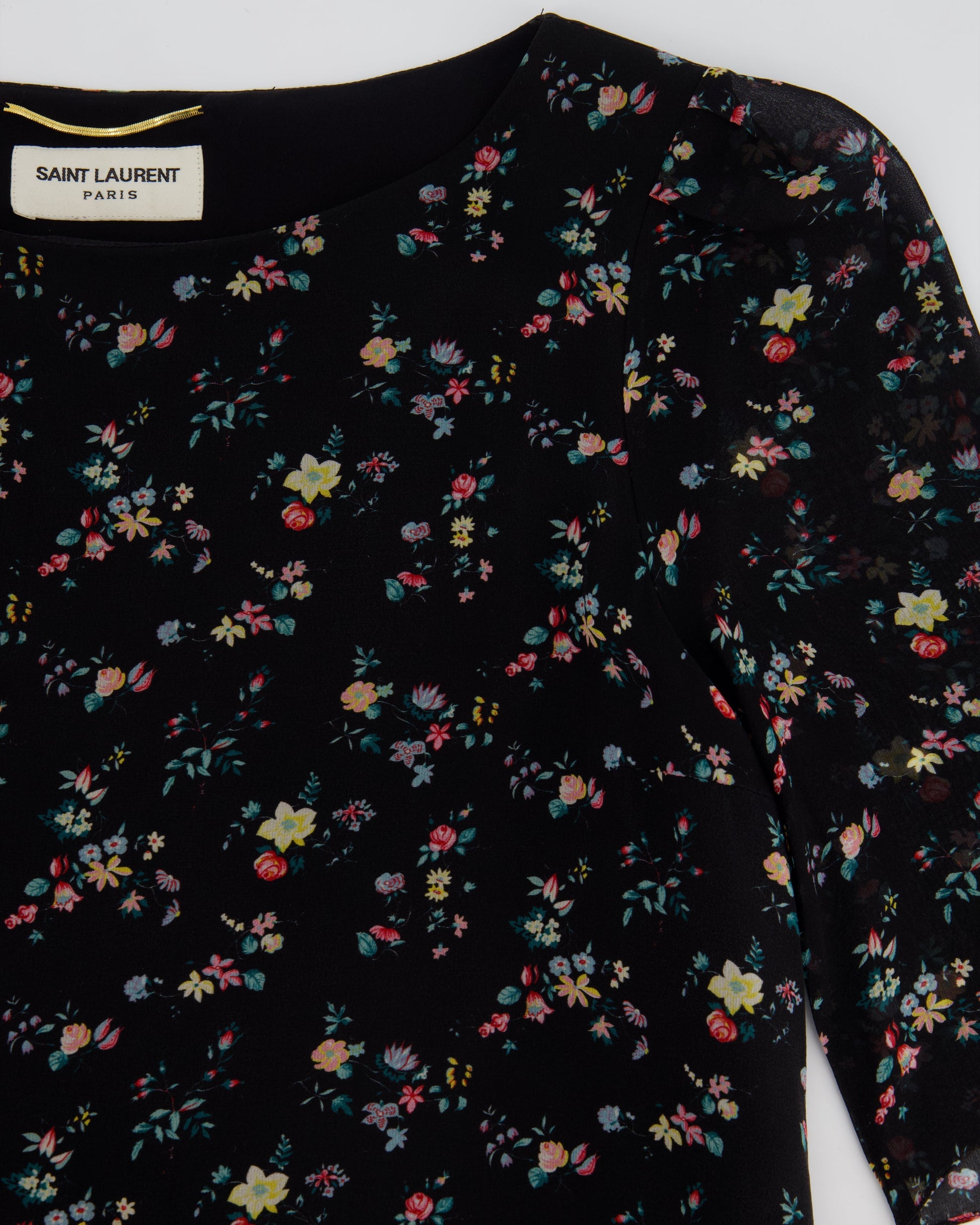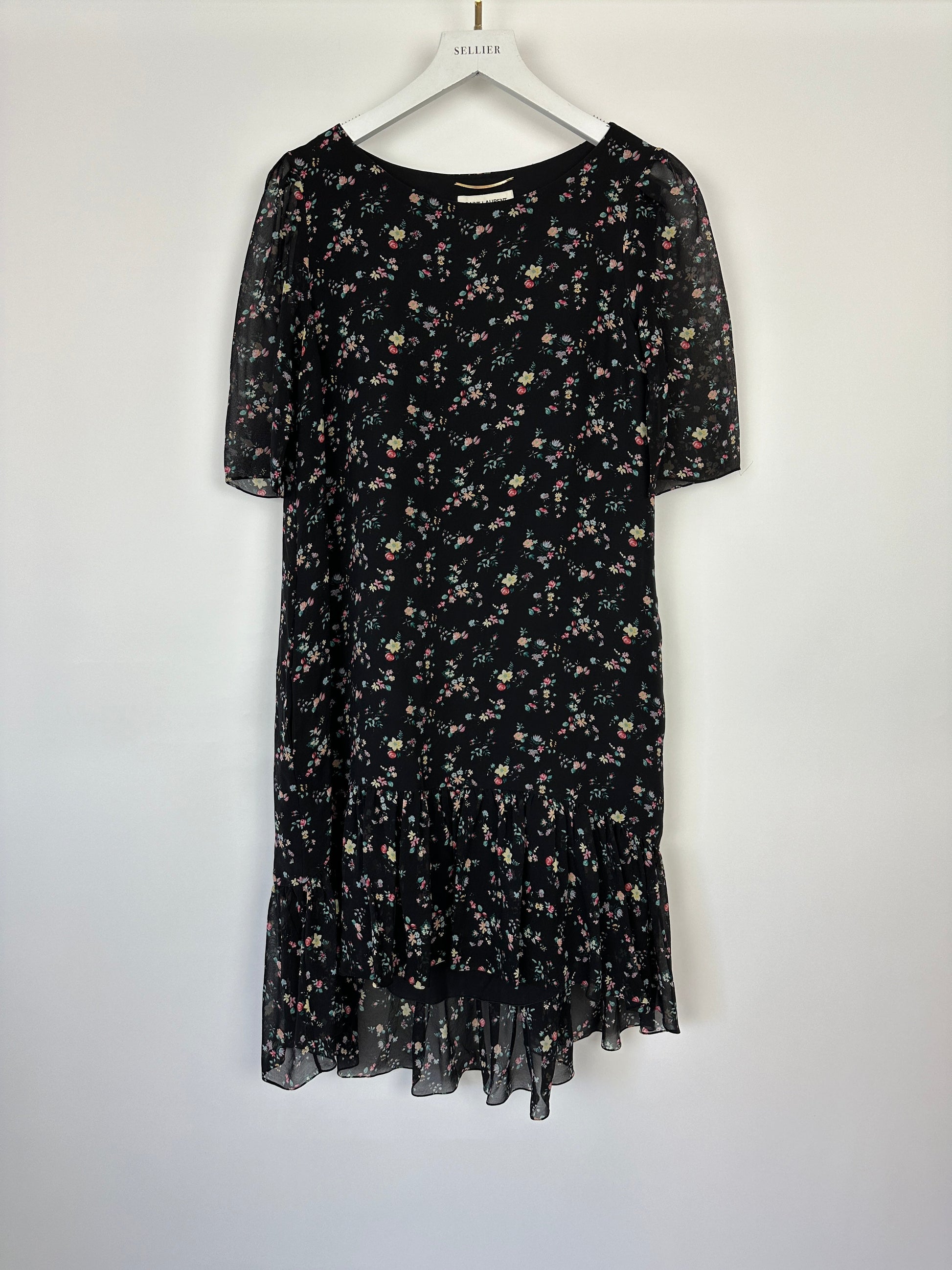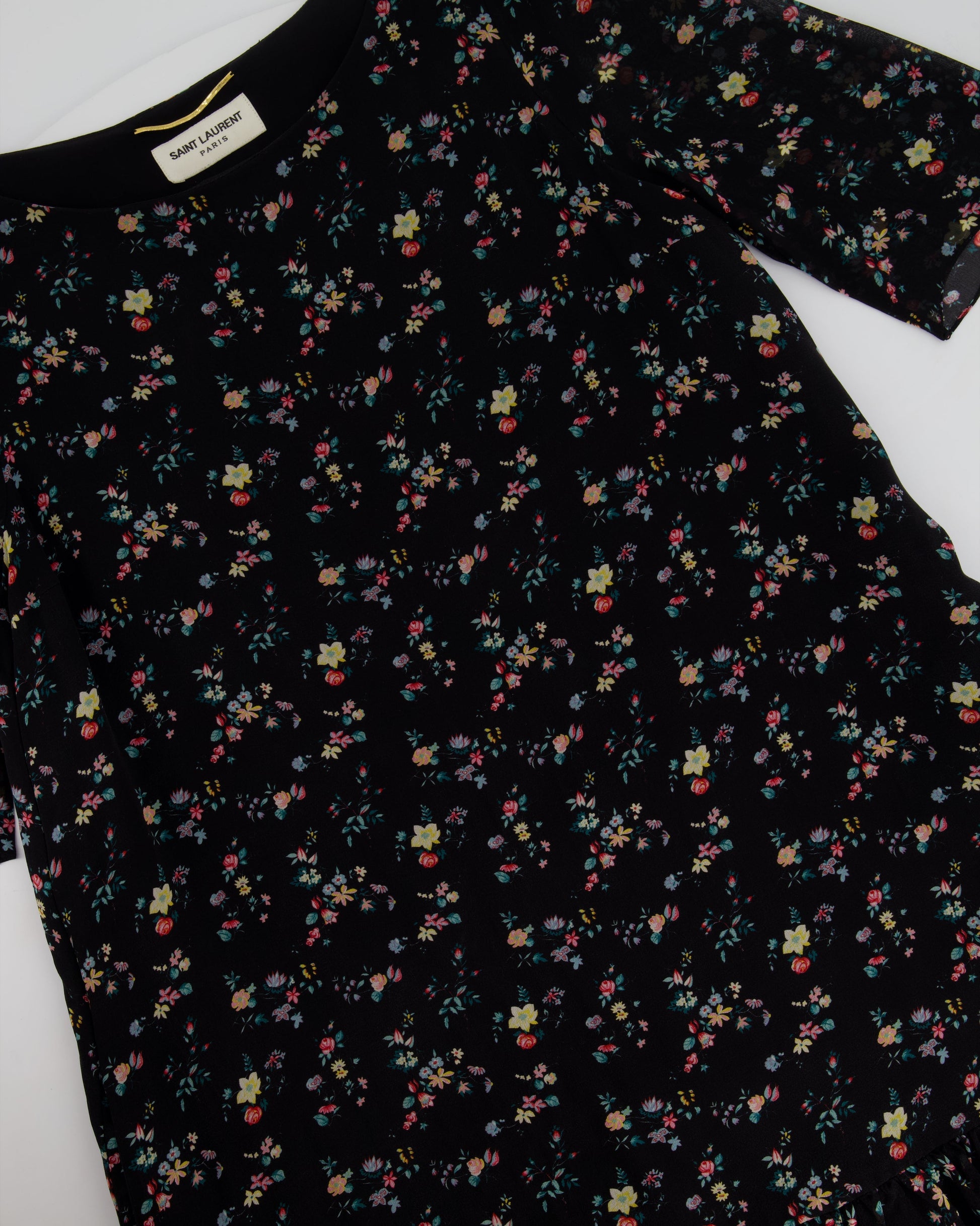 Saint Laurent Black Floral Print Short Sleeve Silk Dress With Ruffle Detail Size FR 36 (UK 8)