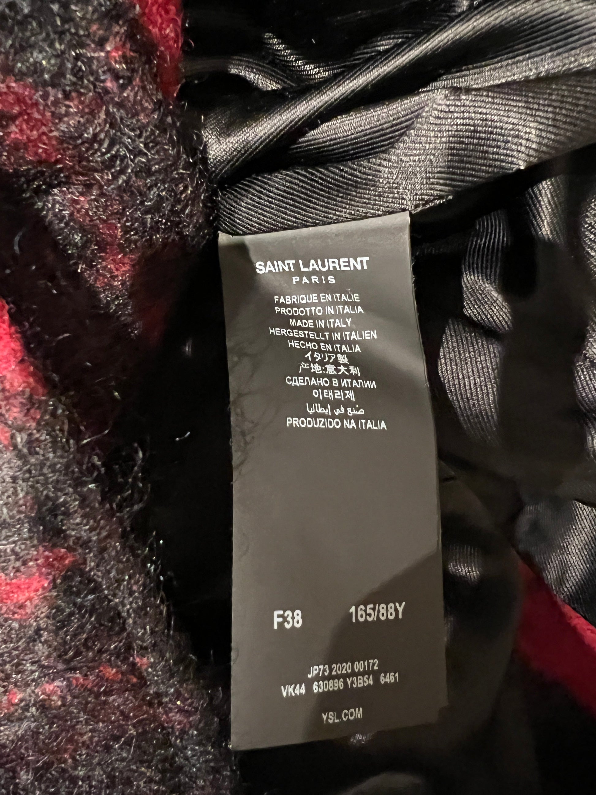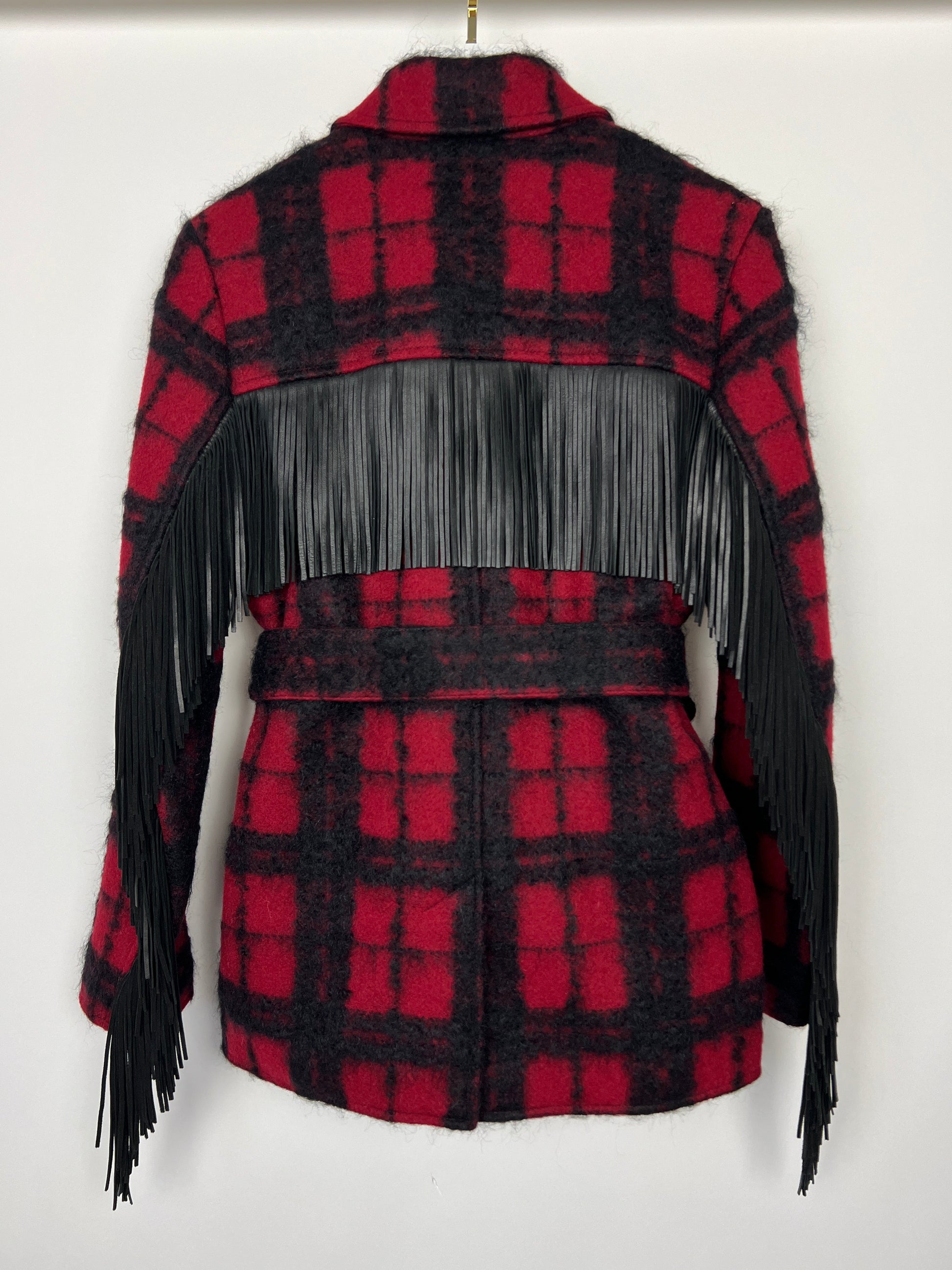 Saint Laurent Red & Black Lumberjack Jacket with Leather Fringe and Belt Details Size FR 38 (UK 10)